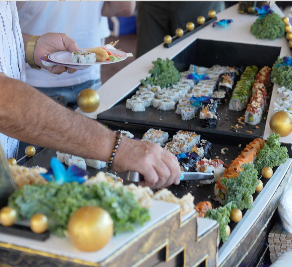The evening features a full sushi and hibachi experience. Guests will enjoy a dynamic dining atmosphere with fresh, high-quality offerings.
